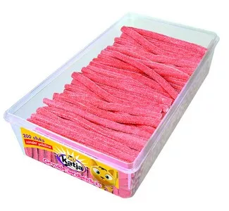 Gevulde aardbeisticks van Katja zijn zoete fruitgums met aardbeiensmaak. Er zitten 200 stuks in een doos.