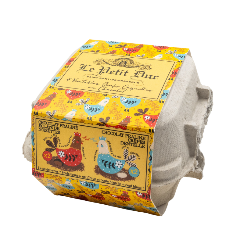 Dans cette boîte, les coquilles d’œufs ont été soigneusement préparées en les vidant, les lavant, les stérilisant, puis remplis de délicieux chocolat, mettant en œuvre tout le savoir faire de la Maison du Petit Duc.