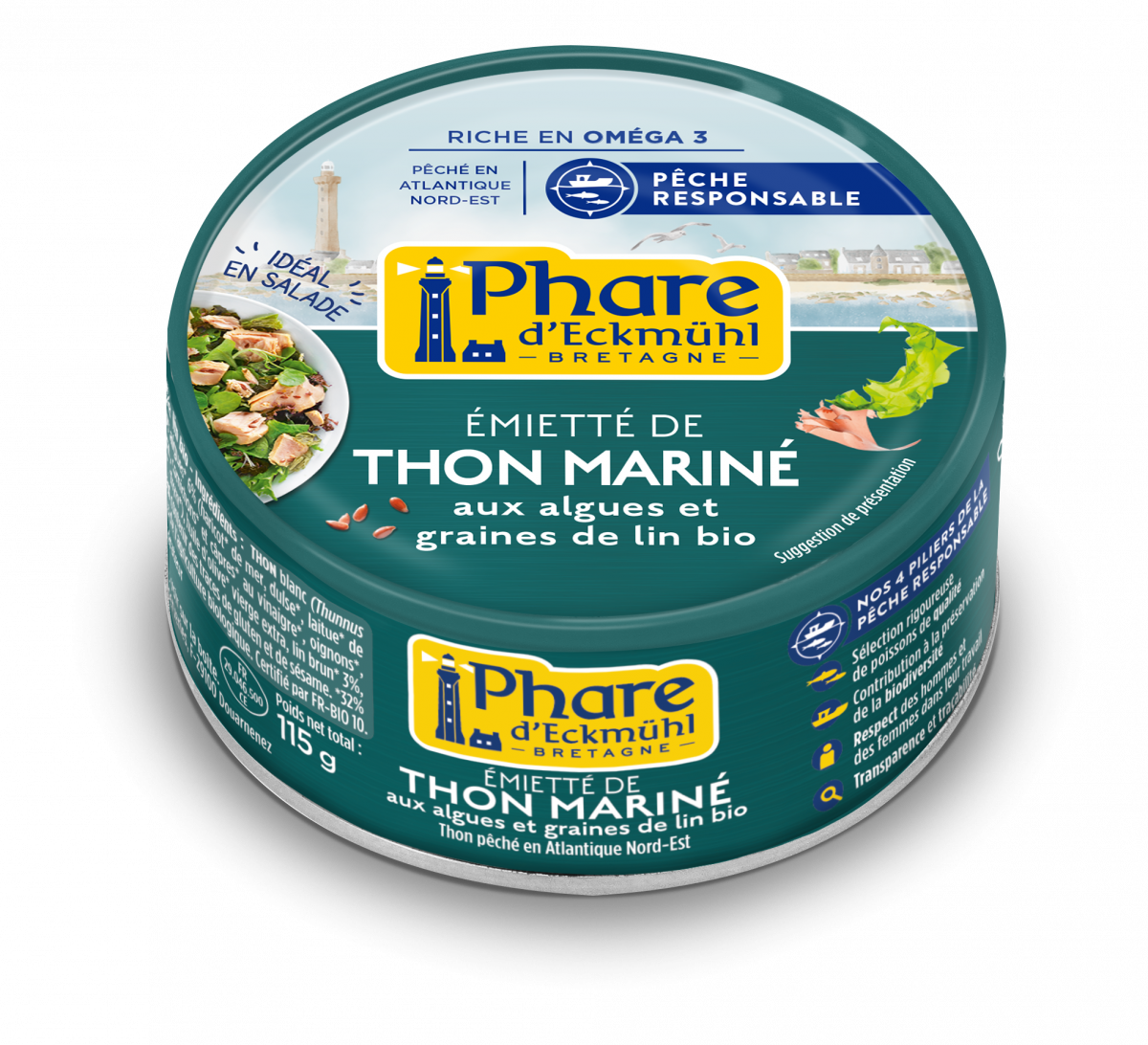 THON blanc (Thunnus alalunga) 67%, tartare d’algues* 21% (dont algues* 6% (haricot* de mer, dulse*, laitue* de mer, wakamé*), huile d’olive* vierge extra, cornichons* et câpres* au vinaigre*, oignons*, échalotes*, ail*, basilic*, origan*, romarin*, thym*), huile d’olive* vierge extra, lin brun* 3%, jus de citron*, sel de Guérande, poivre*. *32% des ingrédients d’origine agricole sont issus de l’agriculture biologique. Certifié par FR-BIO 10.